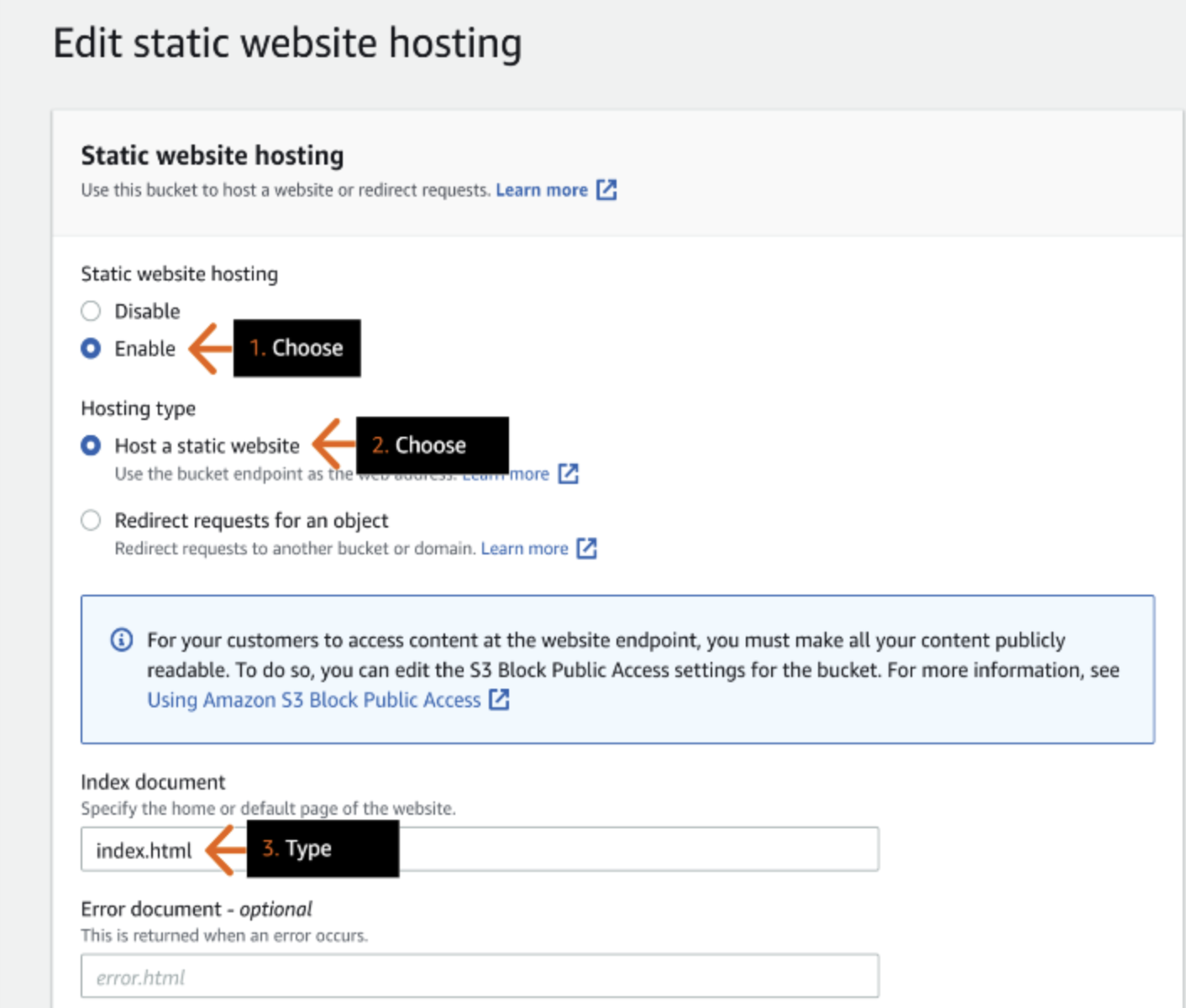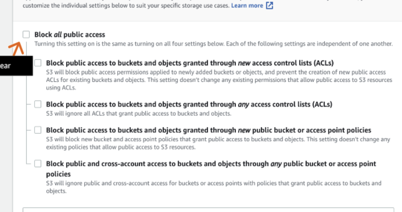 - clear the check box to deselect Block all public access
